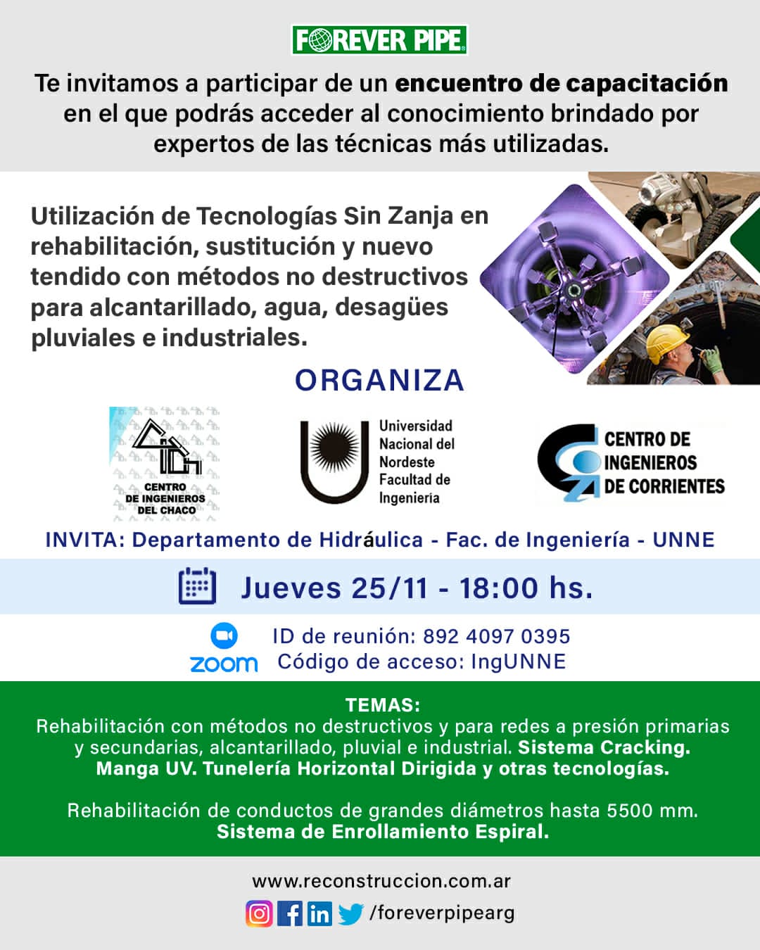 Este jueves 25 de noviembre a las 18 hs se realizará un Webinar organizado por la empresa Forever Pipe sobre la aplicación de tecnologías para la reparación de cañerías sin realizar zanjas. Es un tema de gran interés por lo dado en este materia.